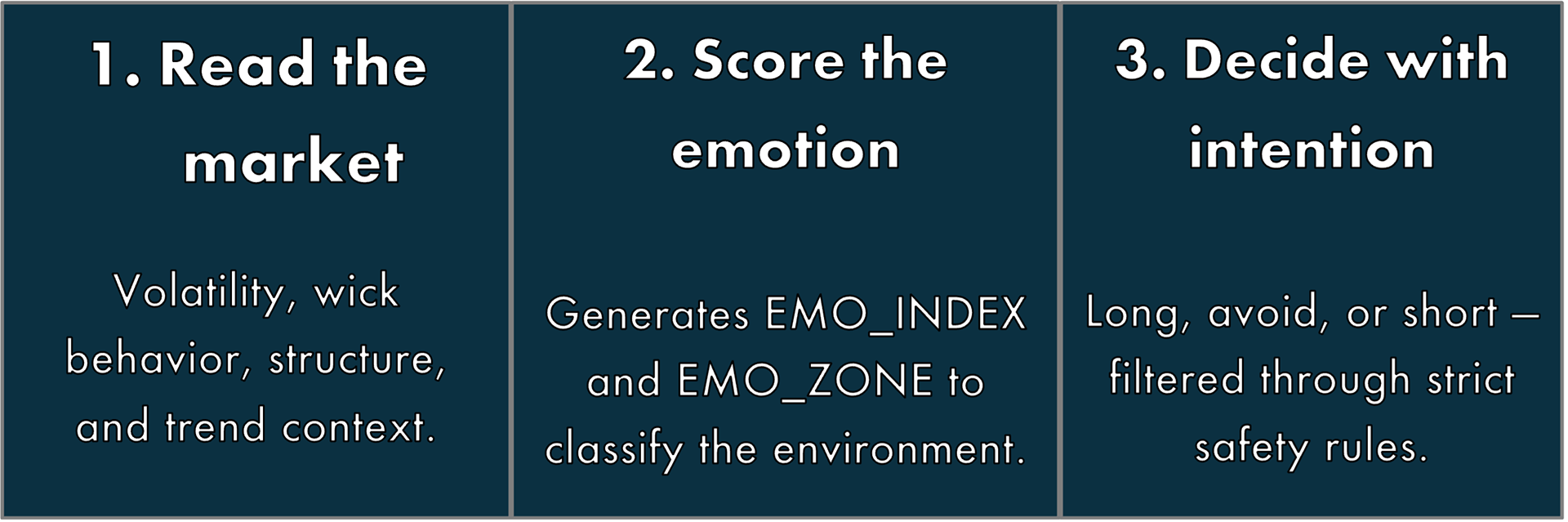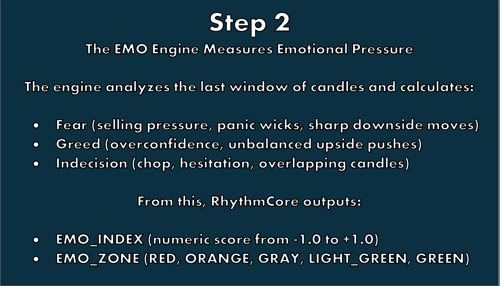 RhythmCore’s EMO_INDEX, EMO_ZONE, and trade signals are algorithm-generated and represent our system’s interpretation of market behavior. These outputs do not recommend or instruct users to take any specific trading action. They should be viewed as market insights only.