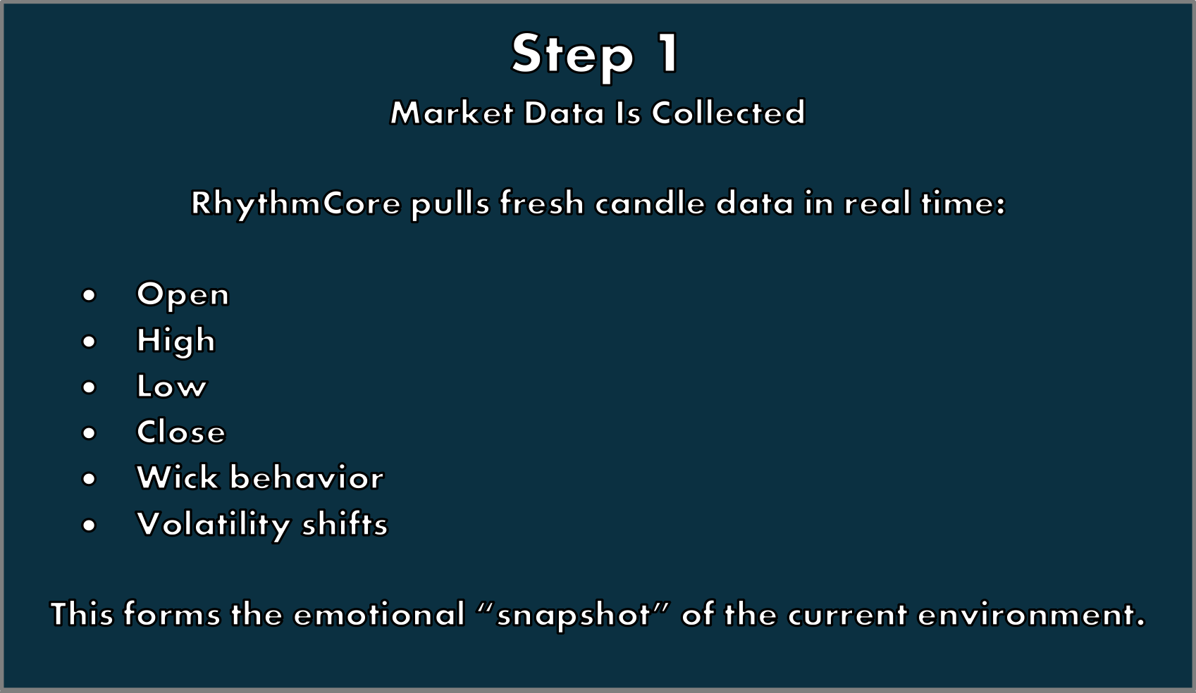 RhythmCore is a one-of-a-kind disciplined engine that reads emotion, filters noise, and executes with intention. RhythmCore analyzes the emotional environment of the market instead of relying on traditional lagging indicators. It looks at how candles behave, not just what they close at. The result is a real-time emotional score and zone classification.