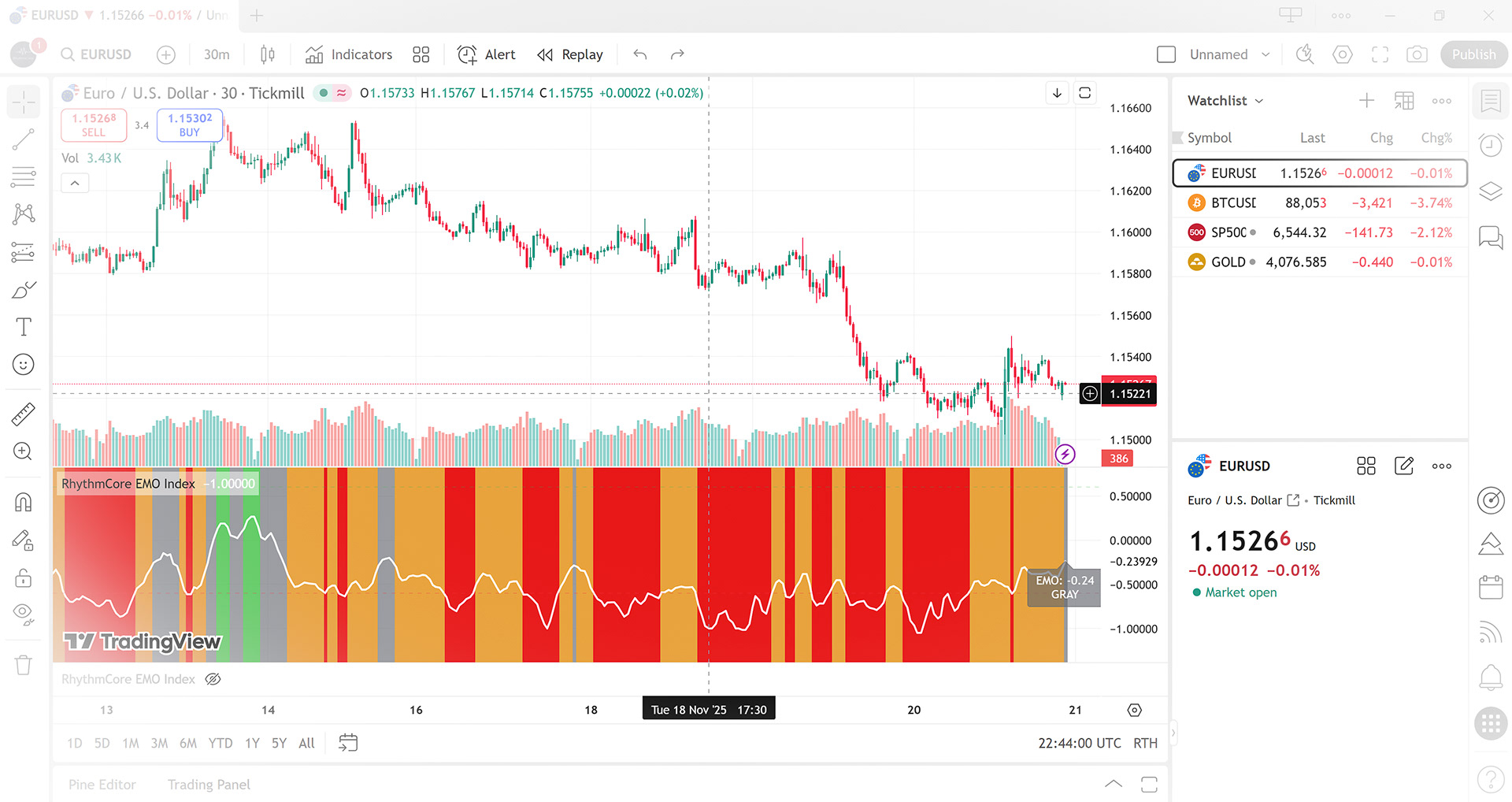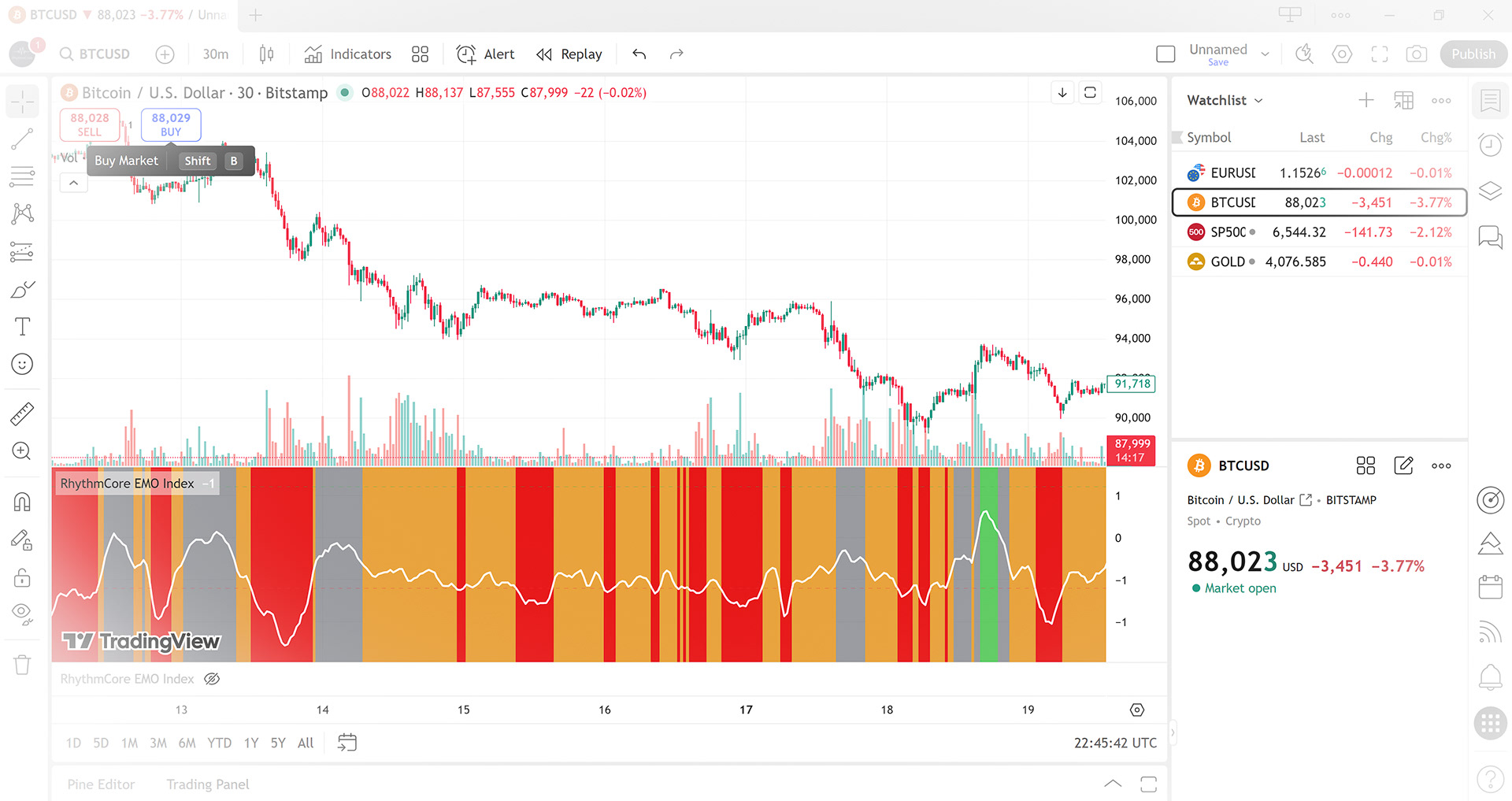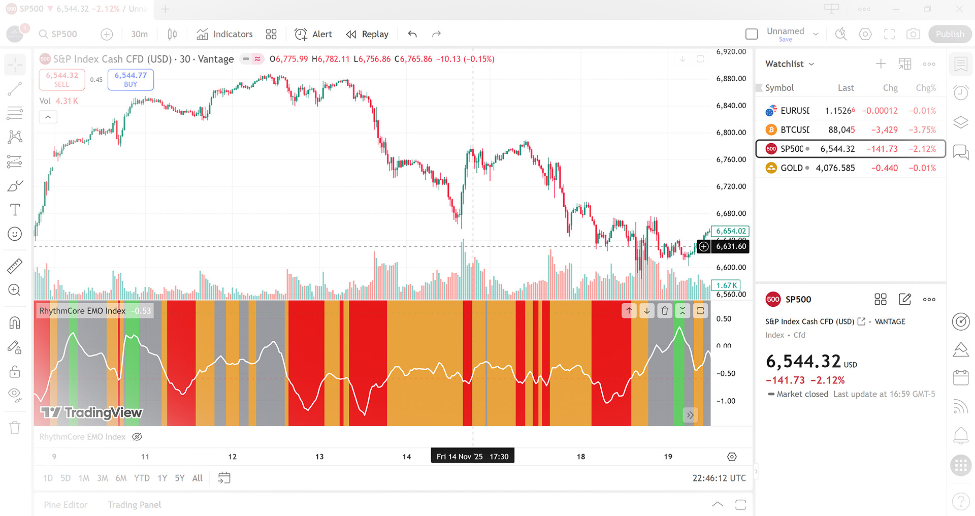 RhythmCore EMO Index is an emotional-environment scanner for financial markets. It reveals fear, panic, greed, exhaustion, complacency, and overall market mood — so traders can make clearer, more confident decisions.