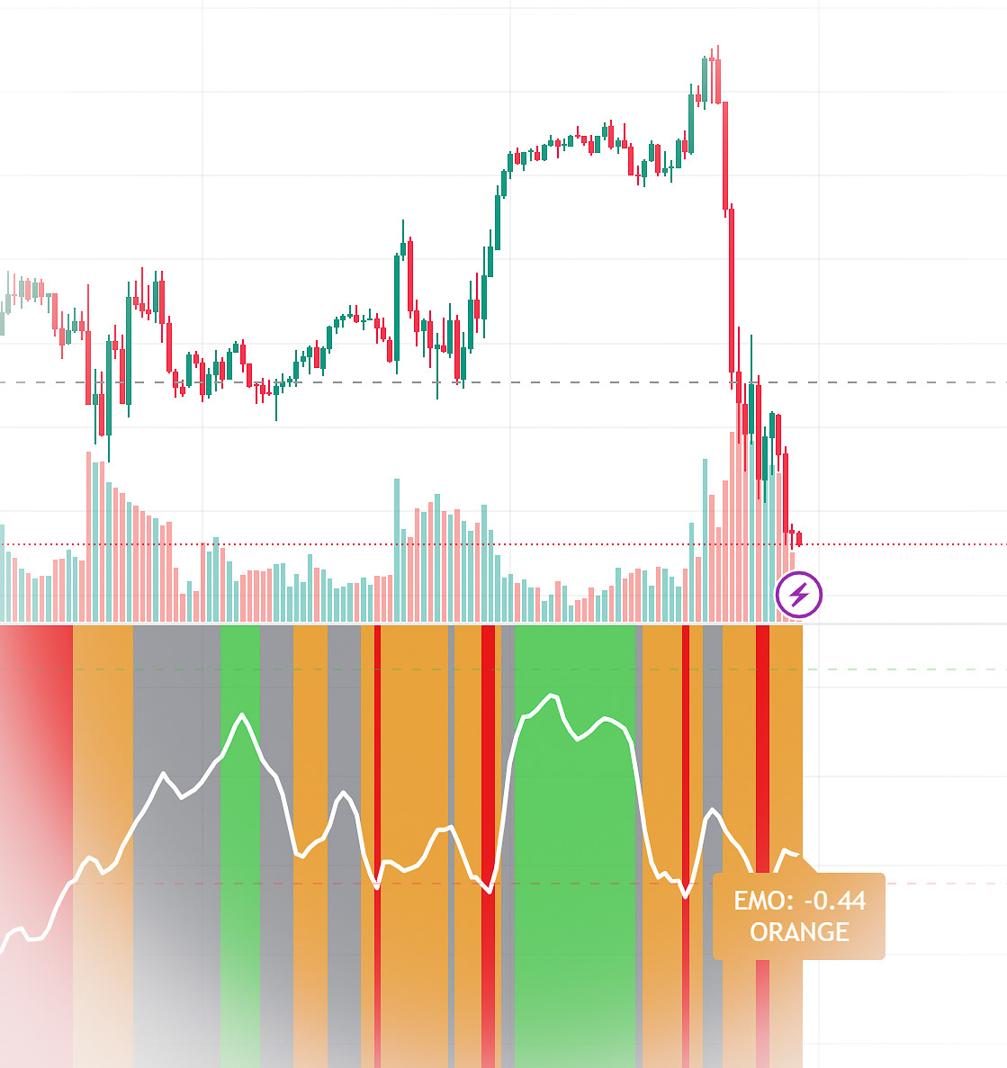 The RhythmCore EMO Index measures the emotional pressure inside the market—fear, greed, indecision, and momentum—